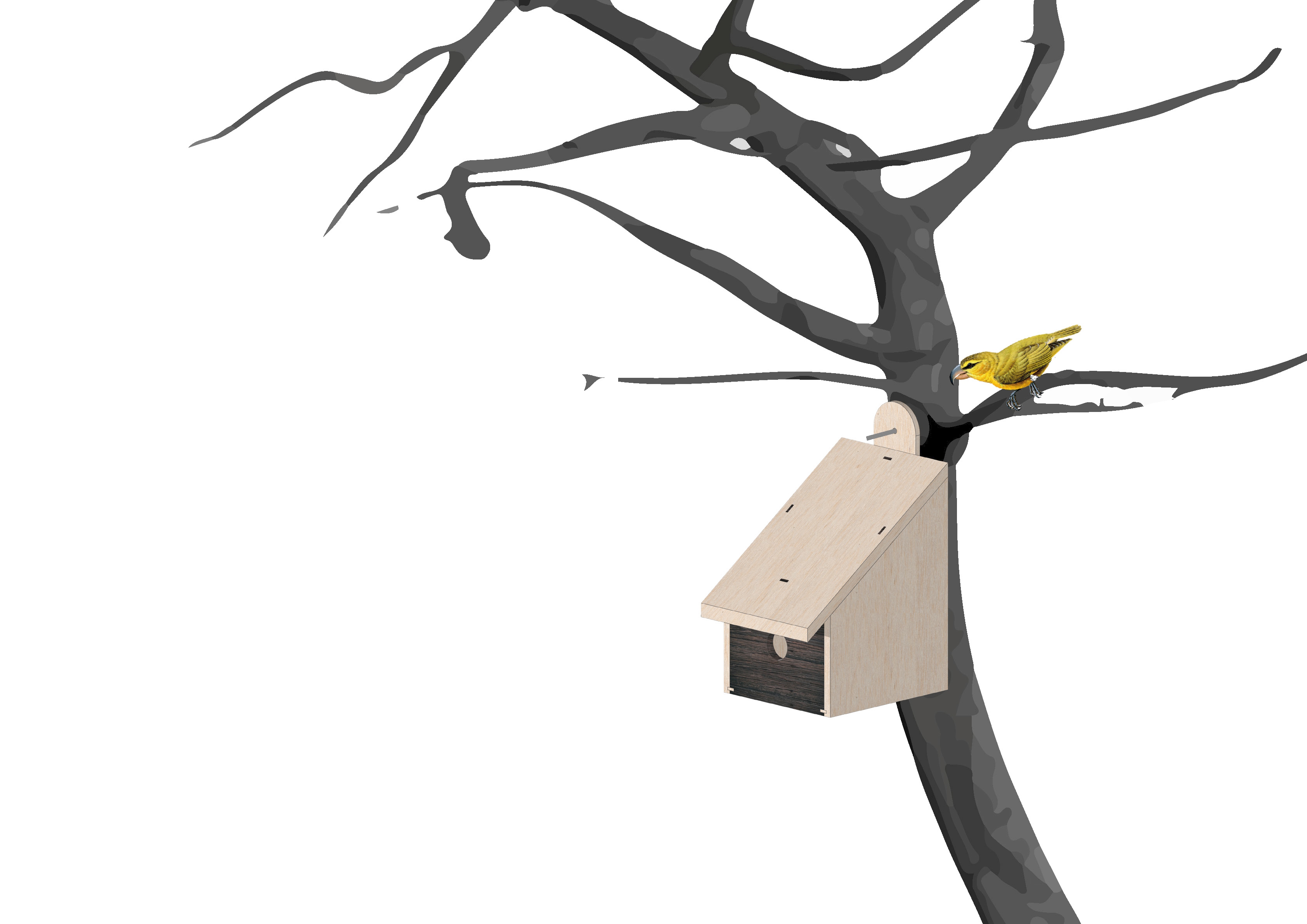 a small nestling place for birds that can be gently pushed by natural forces from side to side; as a concept derived from baby cradles, birdle* applies most natural enviorments for baby birds, and tries to eliminate glue and screws in the process of assembly. birdle* celebrates honest making and minimizes effort of maintainance for caretakers.