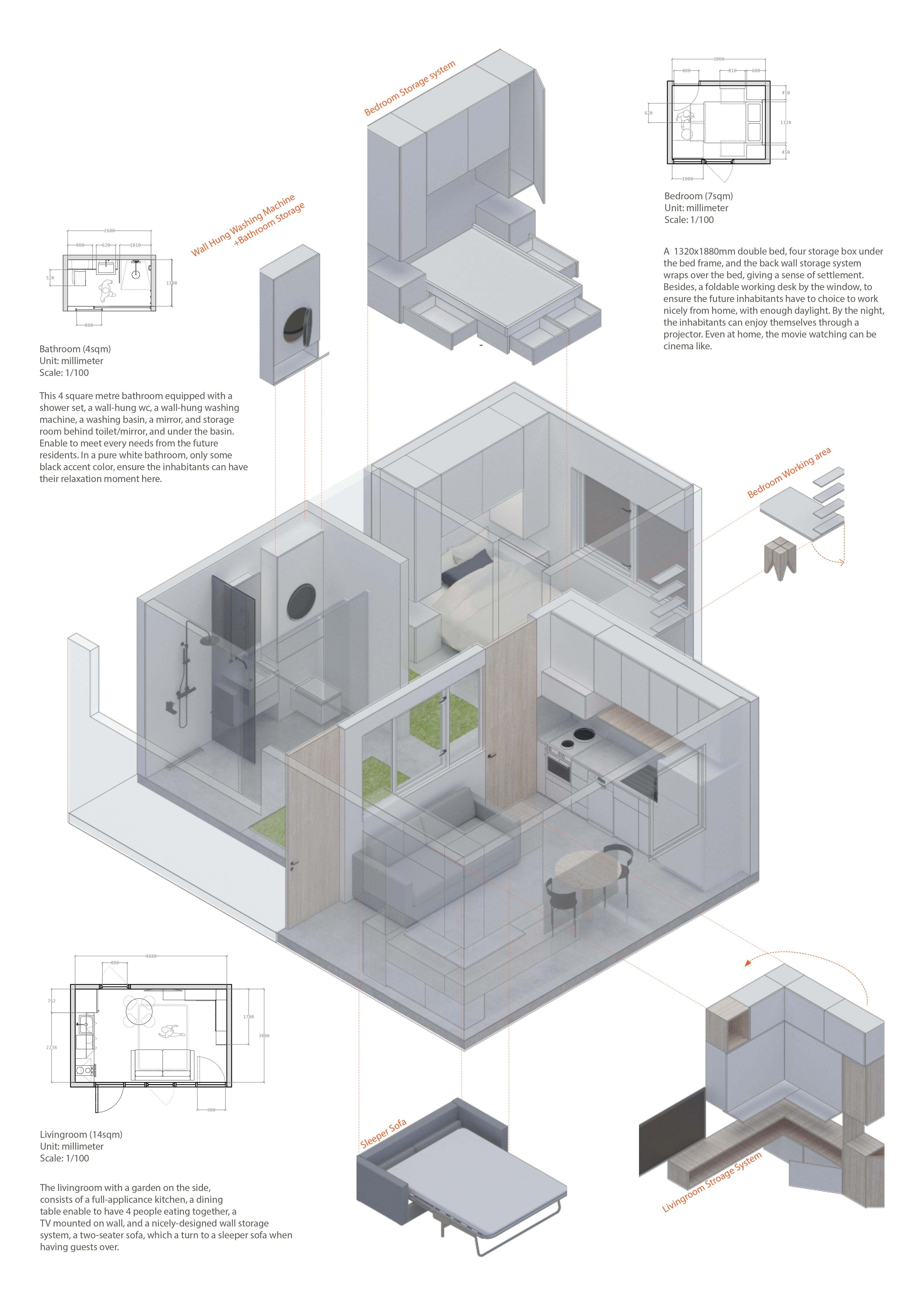 Breathing Module investigates the ultimate experience in living within 25 square metres in terms of functional pods. The living room=14sqm, The bedroom=7sqm, The bathroom=4sqm.